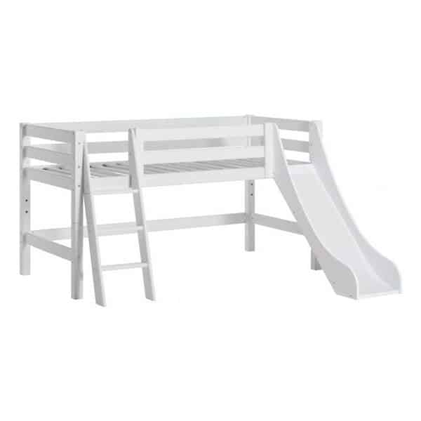 Halvhøj seng med skrå stige og rutsjebane ECO Luxury halvhøjseng er en smart seng til det lidt større barn. Sengen giver mere gulvplads til at lege på og med forhæng omkring er den en hyggelig hule. Sengen er svanemærket – din garanti for at sengen opfyld